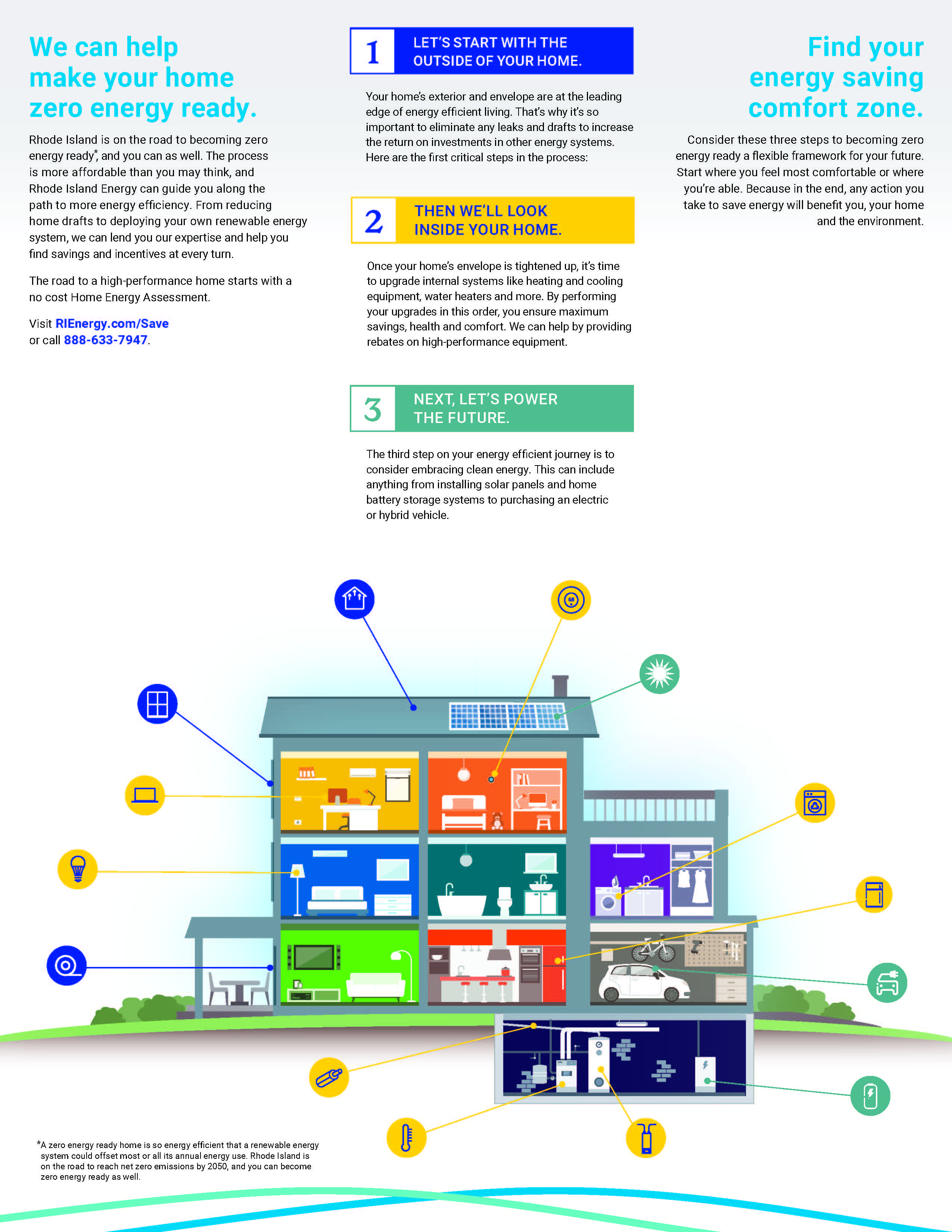 * A zero energy ready home is so energy efficient that a renewable energy system could offset most or all its annual energy use. Rhode Island is on the road to reach net zero emissions by 2050, and you can become zero energy ready as well.